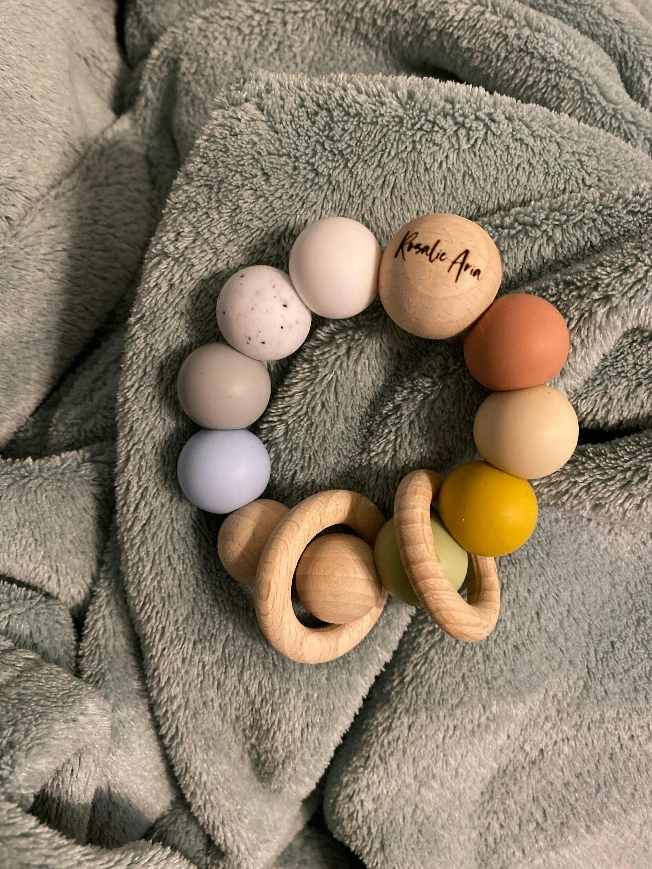 Liebevoll gefertigter Greifring aus Holz- und Silikonperlen.